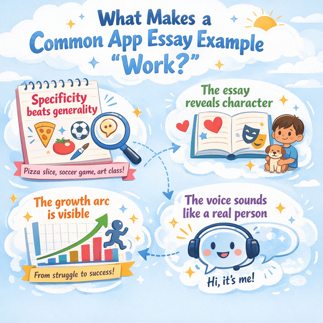 - Specificity beats generality. The essays that stick use real names, real places, and real moments. Not "I learned to work with others" but "At 11 p.m. on a Tuesday in my high school's boiler room, our robotics team was arguing about whether to scrap six weeks of work."