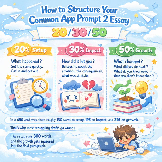 | In a 650-word essay, that's roughly 130 words on setup, 195 on impact, and 325 on growth. That's why most struggling drafts go wrong: the setup runs 300 words, and the growth gets squeezed into the final paragraph. |