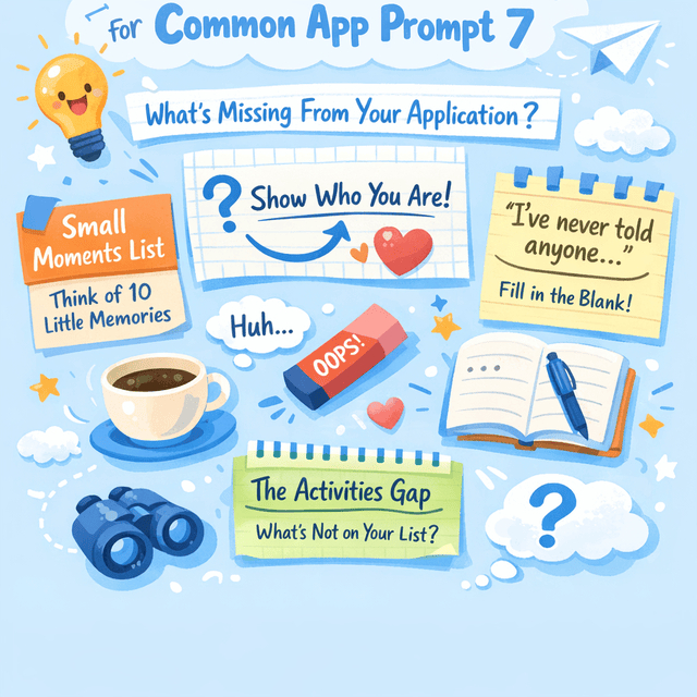 One thing that can help: write your essay first, then figure out which prompt it fits. A lot of strong essays naturally match two or three prompts. If yours lines up cleanly with Prompt 1 or Common App Prompt 5, use that one, it gives readers a frame. Choose Prompt 7 when no other frame fits, not when Prompt 7 feels like the easiest option. |