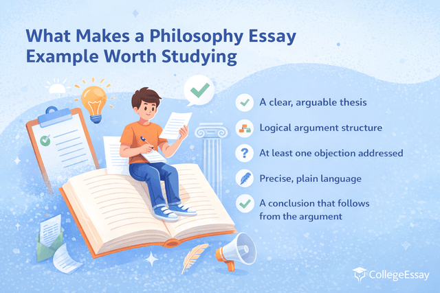 Before you read the examples, it helps to know what you're looking for. Philosophy essays that earn good marks tend to share five qualities. Once you spot these in the examples below, you'll know what to aim for in your own writing.