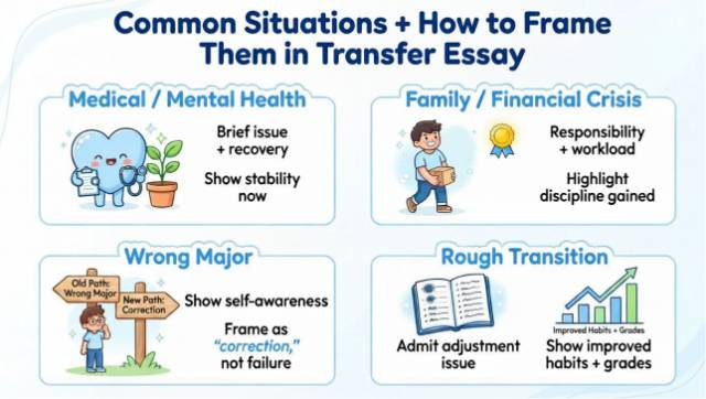 Example language: "I enrolled in a pre-engineering track that, within a year, I recognised wasn't a match for how I think or what I want to do. My performance reflected that disconnect honestly. In the two semesters since adjusting my direction, I've earned a 3.5, my strongest academic work to date." For the full strategic narrative around explaining a major switch in your transfer essay, see our transfer essay changing majors guide. |