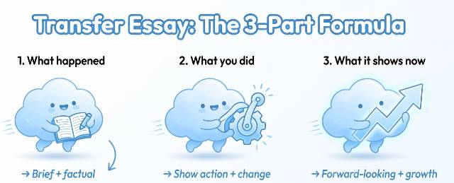 Example language: "My first year was a harder transition than I anticipated. I underestimated the pace and didn't build the habits I needed early enough. By sophomore year, I had restructured how I approached studying and deadlines and my grades show that. I've improved my GPA each semester since." The best low GPA transfer essays share one thing: they end looking forward, not backward. |