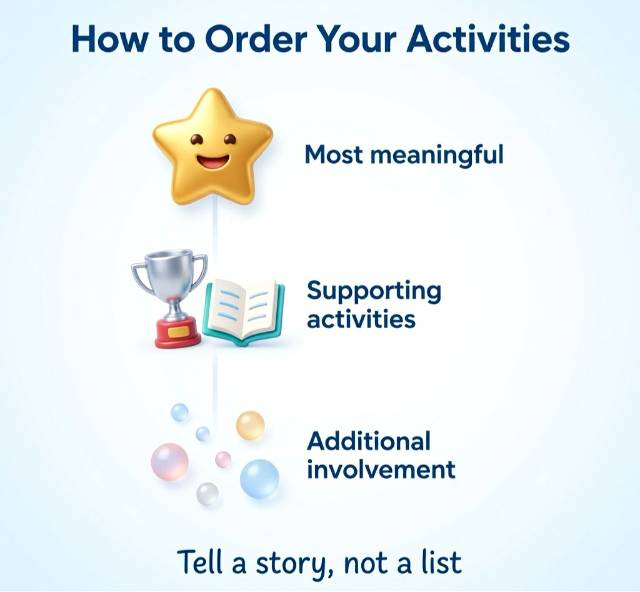 Put your most meaningful activities at the top, not necessarily the most prestigious, but the ones that best represent who you are. If you want admissions to remember you as a community organizer, your community work should lead. If you're a competitive athlete who's also a musician, think about which one defines you more and lead with that.