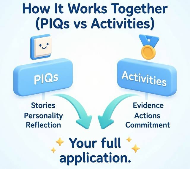 Fill out the UC activities section first. It's more comprehensive, and once it's done, the Common App version is easier to build from you're compressing rather than creating. For full guidance on how the two applications differ beyond the activities section, see UC PIQ vs Common App essay.